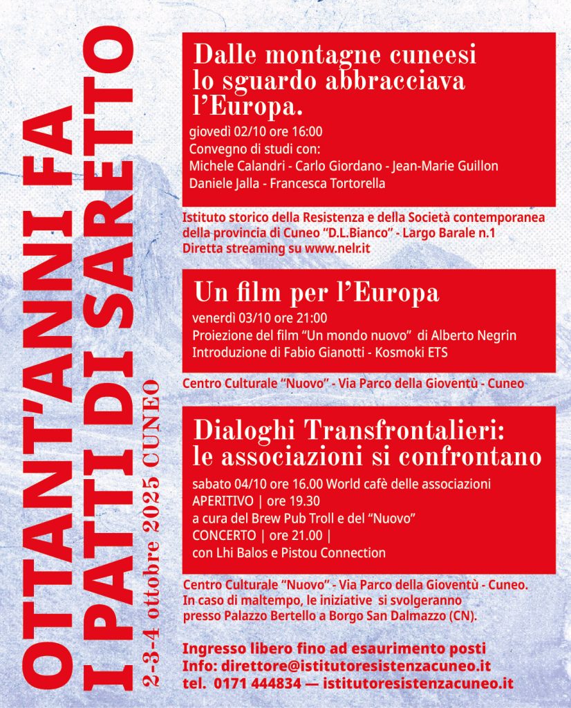 2-3-4 ottobre 2025 | Cuneo | Ottant’anni fa i Patti di Saretto. Dalle montagne cuneesi lo sguardo abbracciava l’Europa 2-3-4 ottobre 2025 Cuneo direttore@istitutoresistenzacuneo.it | Tel. 0171 444834 | www.istitutoresistenzacuneo.it Il triennio 2023-2025 coincide con l’ottantesimo anniversario dei 20 mesi della Resistenza che dall’8 settembre 1943 all’aprile 1945 videro il territorio cuneese impegnato in prima